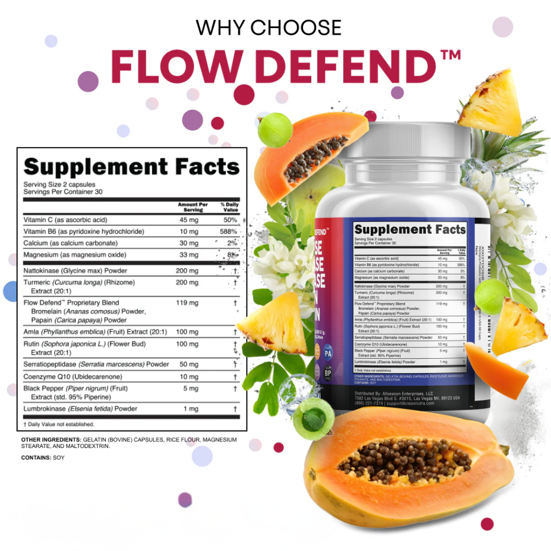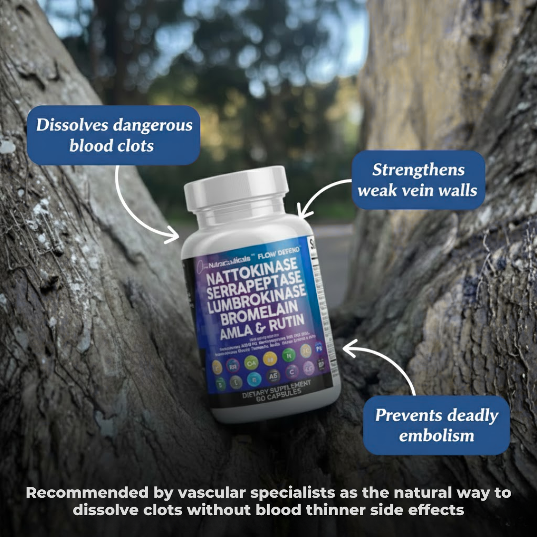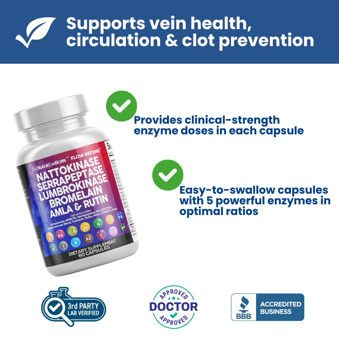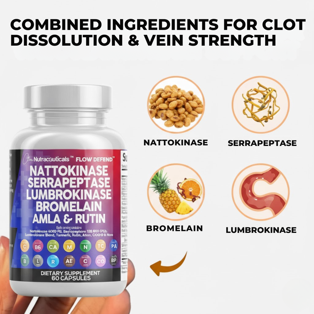 It uses a dual-action enzyme system — Nattokinase and Serrapeptase to dissolve existing fibrin clots and calm inflammation, while Rutin, Lumbrokinase, and Bromelain strengthen vein walls and restore natural flow.